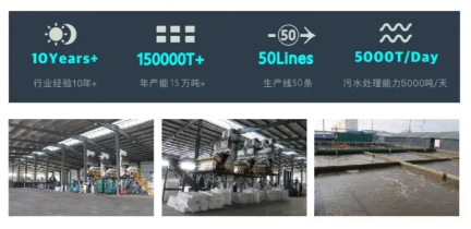 生产基地具备丰富的产业链优势,成本优势,拥有国内领先的生产设备及充裕的环保产能,公司在10余年深度行业经验的基础上,创新与匠心精神指引下,具备全品类、多种类的全产业链条,年再生塑料产能15万吨+,挤出机生产线50条,环保污水处理能力5000吨/天。